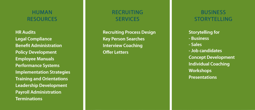 Services include HR Audits, Legal Compliance, Benefit Administration, Recruiting Process Design, Key Person Searches, Interview Coaching, Storytelling for Business / Sale / Job Candidates.